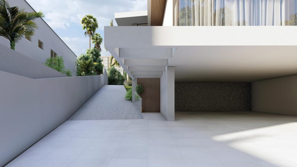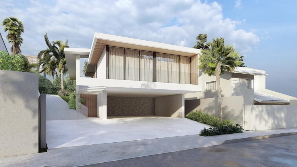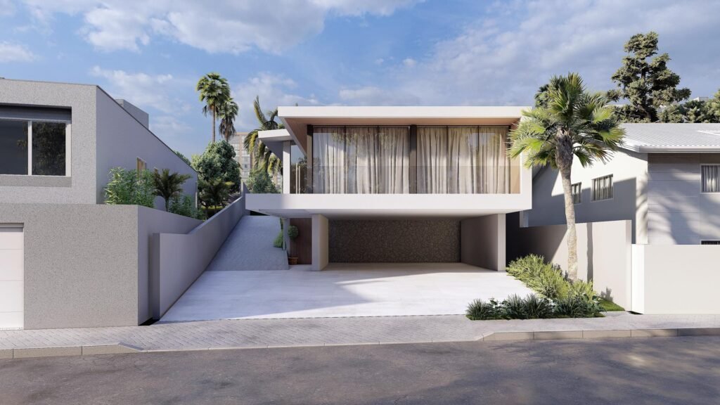 Suspensa com leveza sobre o terreno em declive, esta residência se revela com uma elegância sutil, que combina transparência, proporção e acolhimento. A fachada frontal é marcada por grandes panos de vidro protegidos por cortinas fluidas, que suavizam a luz natural e adicionam movimento à composição. O volume superior, de linhas retas e limpas, flutua sobre um embasamento recuado, criando um jogo visual entre leveza e solidez.