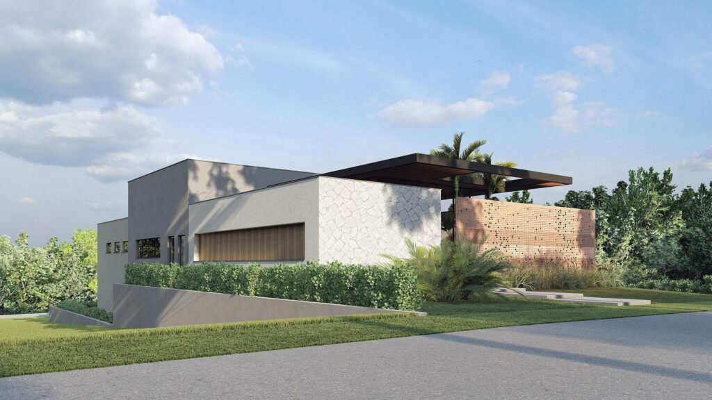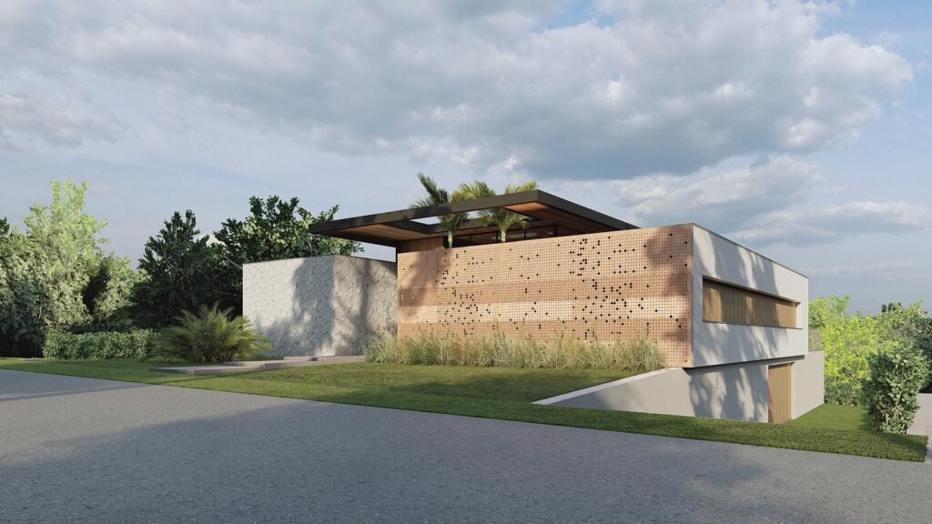 Essa casa exala serenidade logo no primeiro olhar. Com um design contemporâneo e linhas horizontais bem marcadas, ela se integra perfeitamente à natureza ao seu redor, como se tivesse nascido ali. A fachada é uma composição harmônica de materiais naturais: pedra clara, madeira e um painel vazado em cerâmica que filtra a luz com delicadeza, criando sombras orgânicas e dinâmicas ao longo do dia.