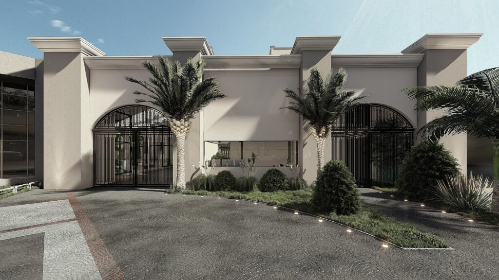 Este condomínio OJC transmite imponência e equilíbrio já no primeiro contato visual. A fachada principal, com sua entrada marcante emoldurada por colunas robustas e elegantes arcos metálicos, revela um projeto que une tradição e modernidade. As palmeiras estrategicamente posicionadas e o paisagismo bem cuidado suavizam a arquitetura sólida, acolhendo moradores e visitantes com sofisticação.