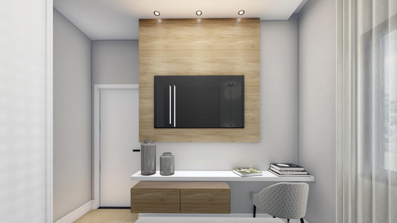 As torres residenciais ao fundo se erguem com sobriedade em tons neutros, que harmonizam com o ambiente urbano. A disposição simétrica das janelas e a volumetria limpa criam um ritmo visual agradável, transmitindo organização, funcionalidade e tranquilidade.