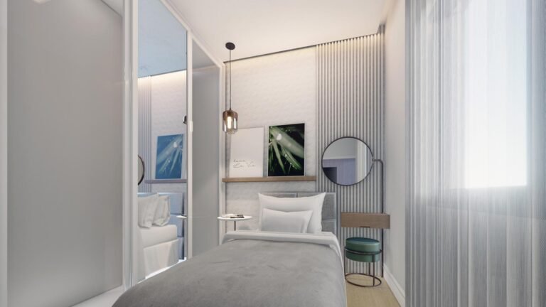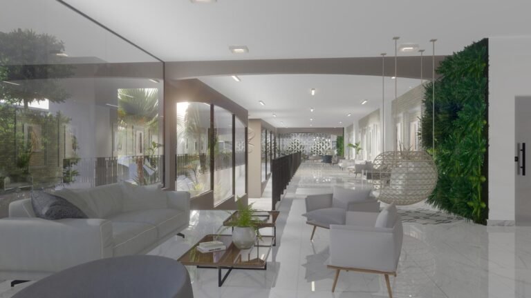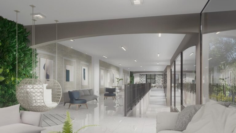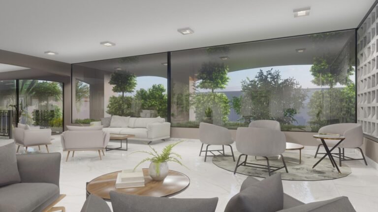 O condomínio foi claramente pensado para oferecer praticidade e bem-estar no dia a dia: acessos amplos e bem definidos, áreas de convivência integradas e um paisagismo que valoriza tanto a estética quanto o conforto. A fachada térrea, com amplos panos de vidro, sugere transparência, segurança e conexão com a cidade — ao mesmo tempo em que preserva a privacidade e o aconchego do interior.