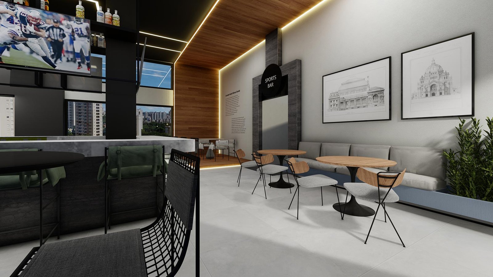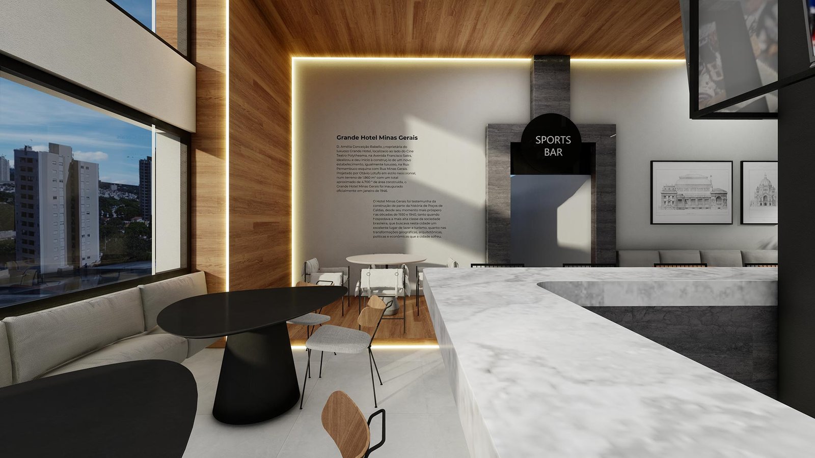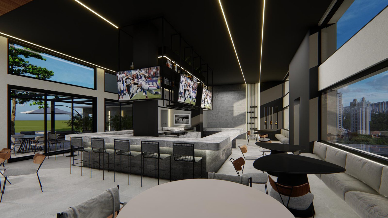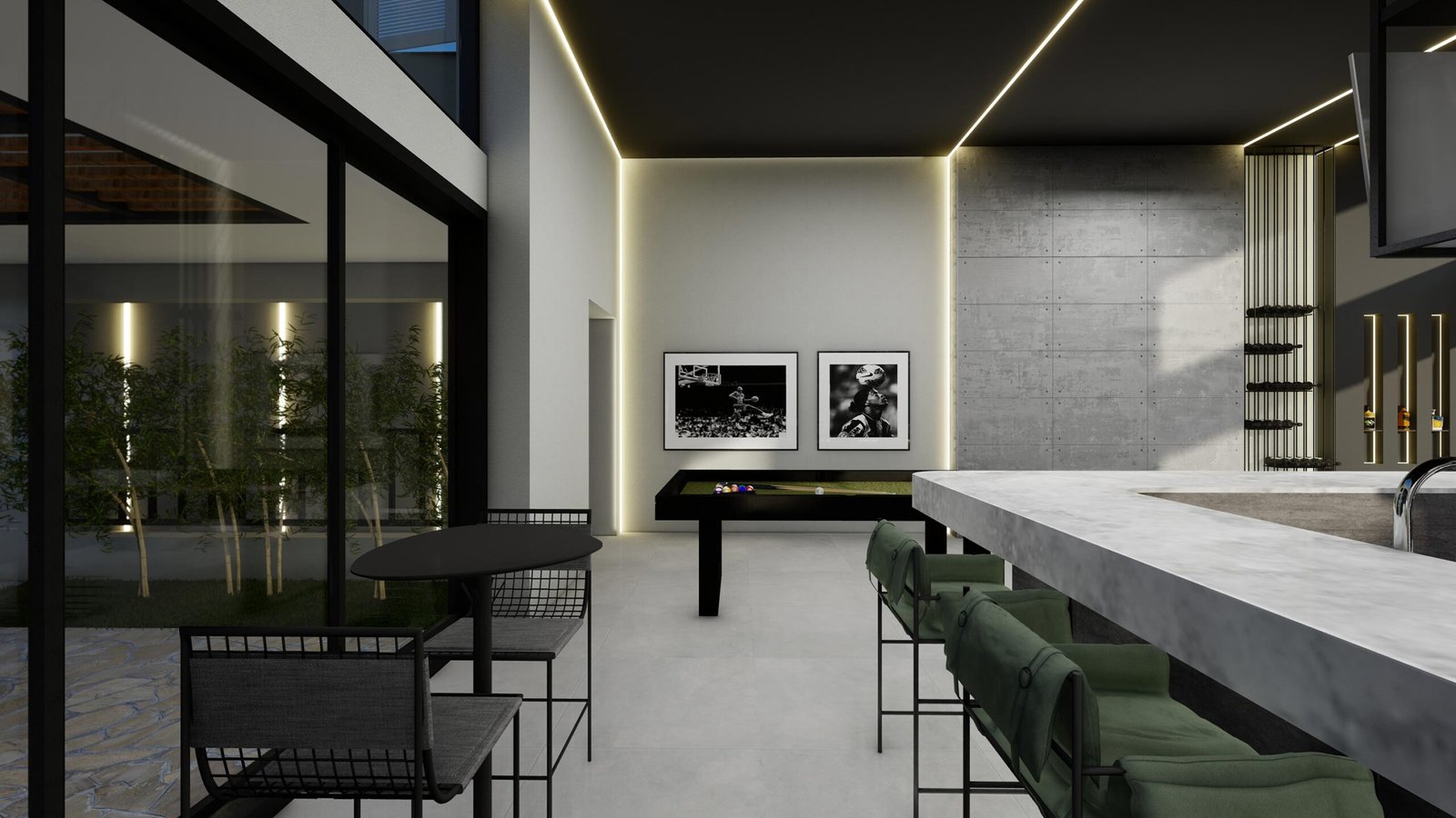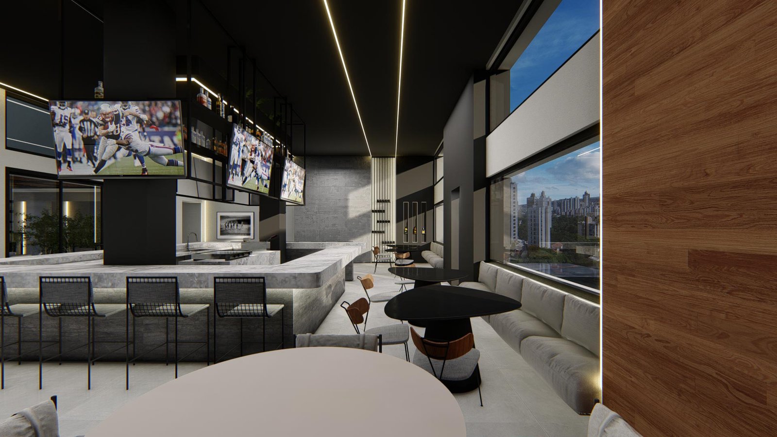 Já o bar apresenta uma proposta distinta, marcada por um clima mais intimista e descontraído. O uso de tons mais sóbrios, aliados a revestimentos texturizados e iluminação pontual, cria uma ambientação moderna e envolvente. O balcão de destaque, com acabamentos sofisticados, torna-se o ponto de encontro ideal para momentos de relaxamento, seja para um drink casual ou para uma experiência social mais descontraída.