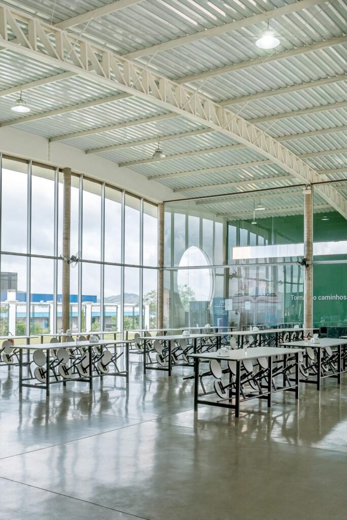 Já o refeitório apresenta uma arquitetura singular, com cobertura de curvas suaves que conferem leveza e movimento ao conjunto. A ampla pele de vidro conecta o espaço à paisagem ao redor, trazendo a natureza para dentro e tornando o ambiente mais acolhedor. A estrutura em telhado curvo foi a solução encontrada para vencer o grande vão, garantindo amplitude e continuidade visual sem comprometer a leveza do projeto.