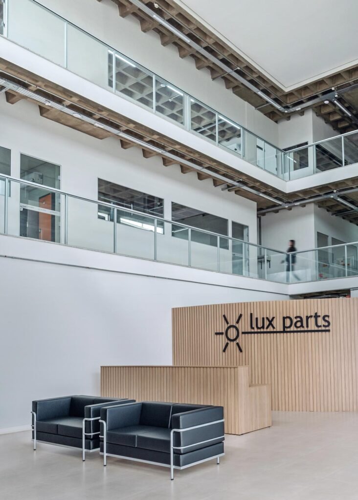 O edifício da administração se destaca pela imponência de suas linhas retas e volumes bem definidos. A fachada marcada pelo uso de vidro cria uma atmosfera de transparência e modernidade, permitindo que a iluminação natural invada os ambientes internos e valorize os espaços de trabalho. A composição transmite solidez e elegância, reforçando a identidade da empresa e sua preocupação em oferecer ambientes de qualidade para seus colaboradores.